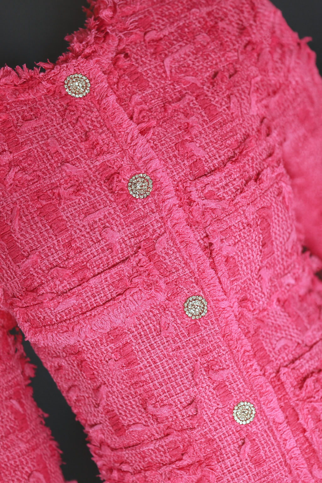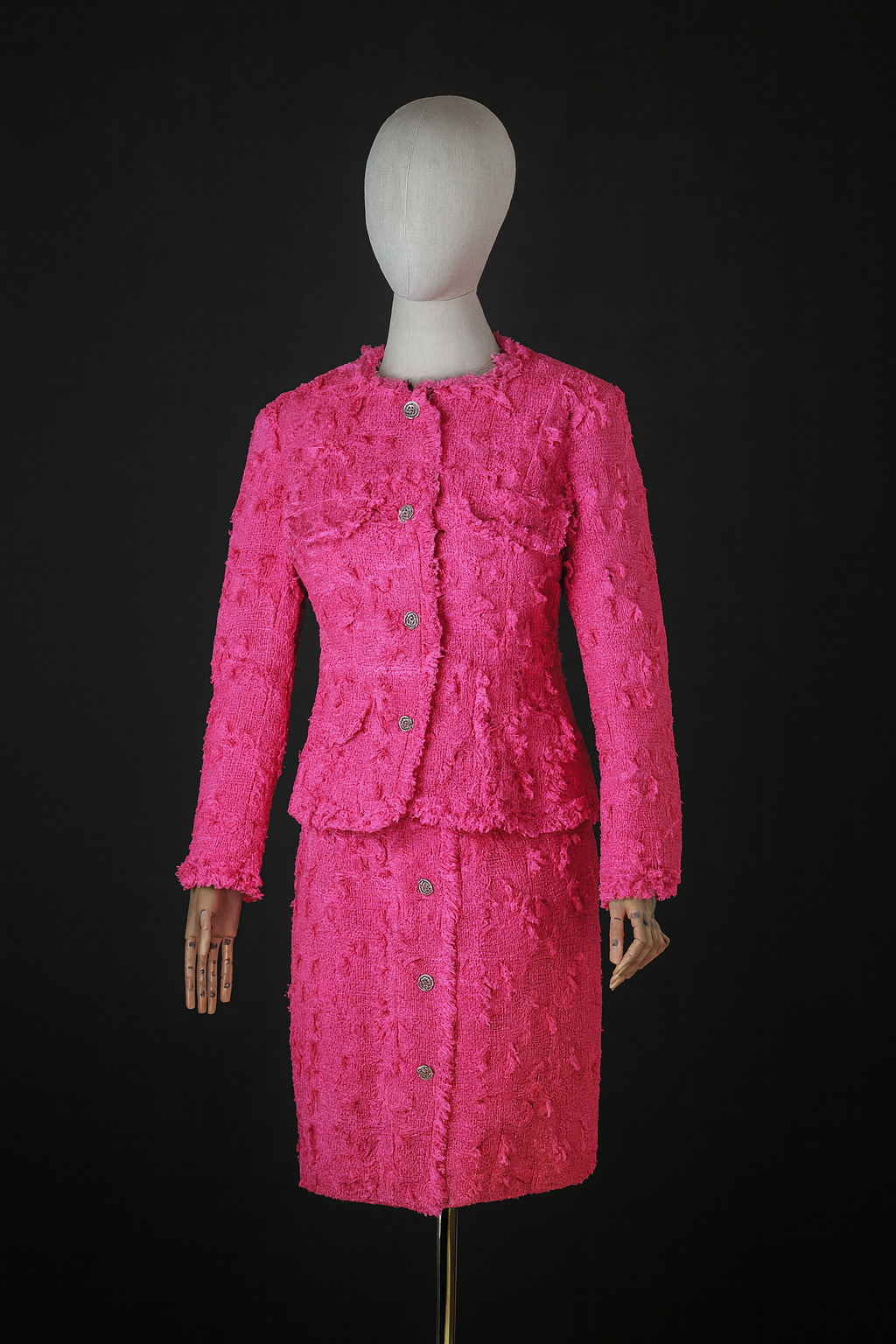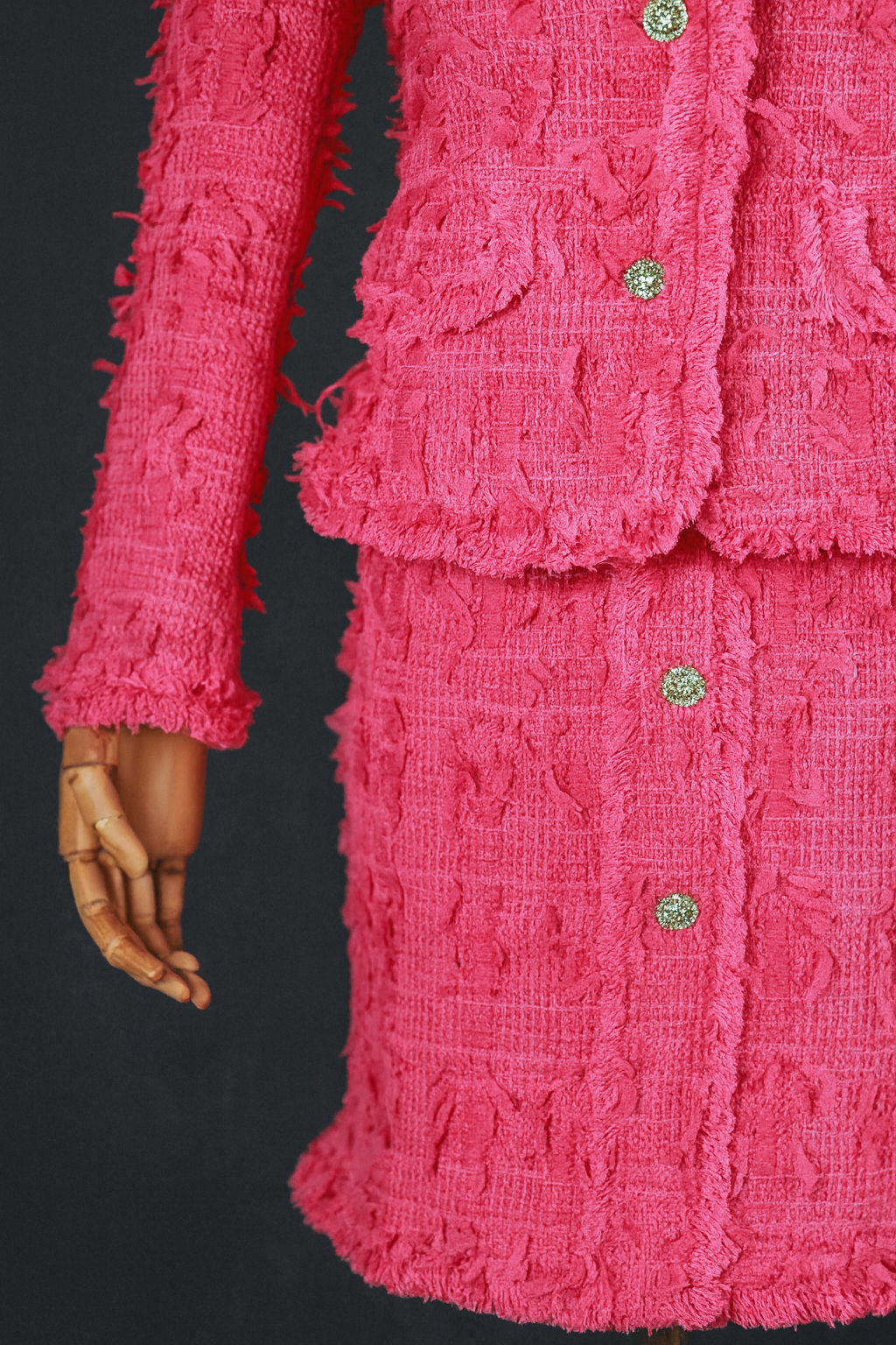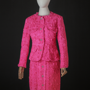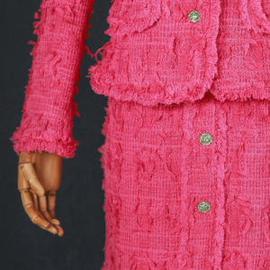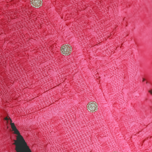 Infused with the elegance of a cherry blossom, this ensemble is crafted from natural material in a charming shade of pink. The long-sleeved blazer is tastefully adorned with high-quality decorations, adding a luxurious touch. These details elegantly complement the fabric, creating a harmonious and sophisticated look.