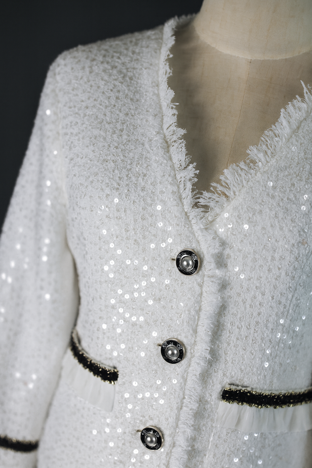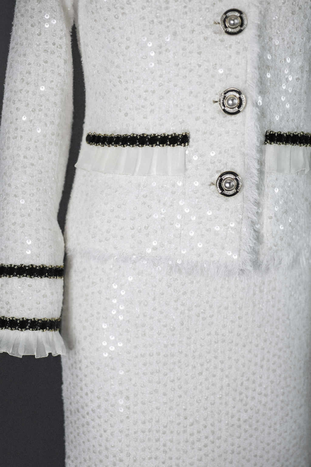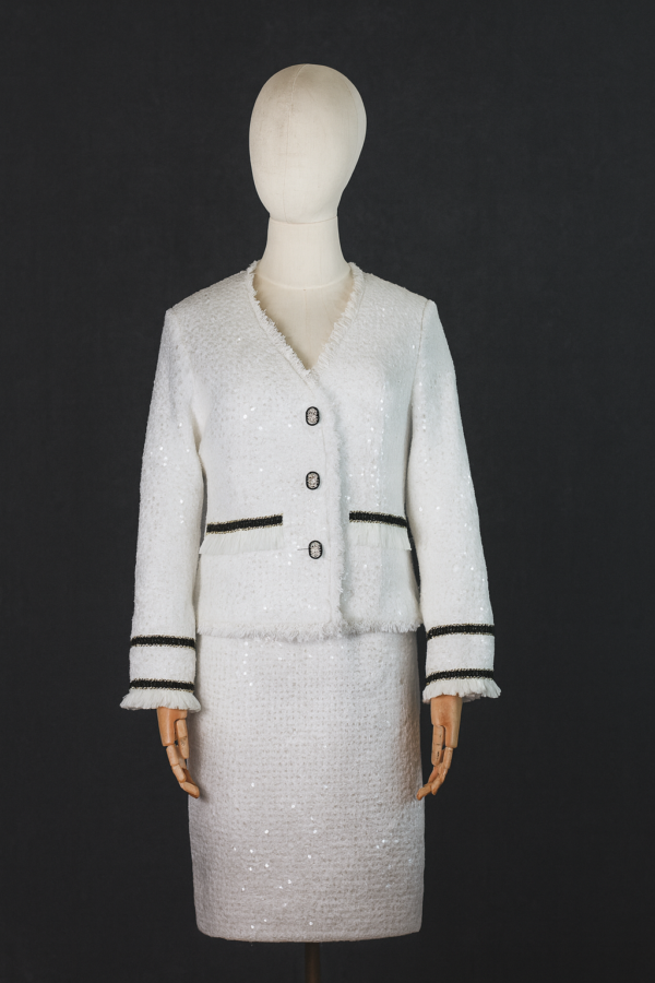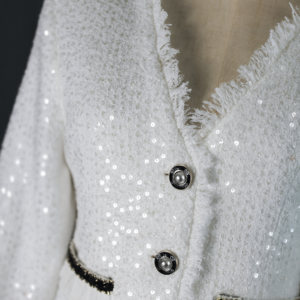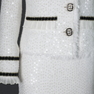 In an exclusive league, the attire is designed from radiant white tweed fabric that mesmerizingly captures attention. Embellished with extravagant pearls and gleaming silver adornments, the garment radiates luxury. It’s further enhanced by sophisticated silver buttons, providing a luxurious finishing touch, making the outfit ideal for occasions requiring unmatched elegance and refinement.