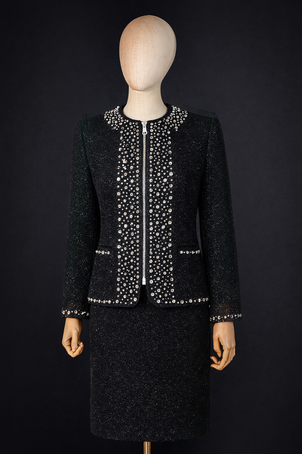 Sophisticated and effortlessly striking, this black two-piece skirt suit is a timeless wardrobe essential elevated with refined sparkle. The tailored jacket features a sleek front zipper and intricate crystal embellishments along the neckline, front panel, cuffs, and pockets, adding subtle glamour to a classic silhouette.