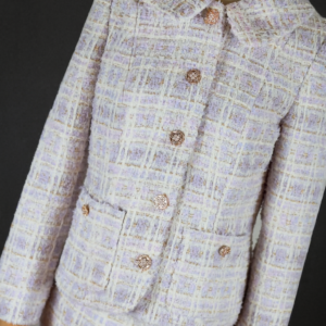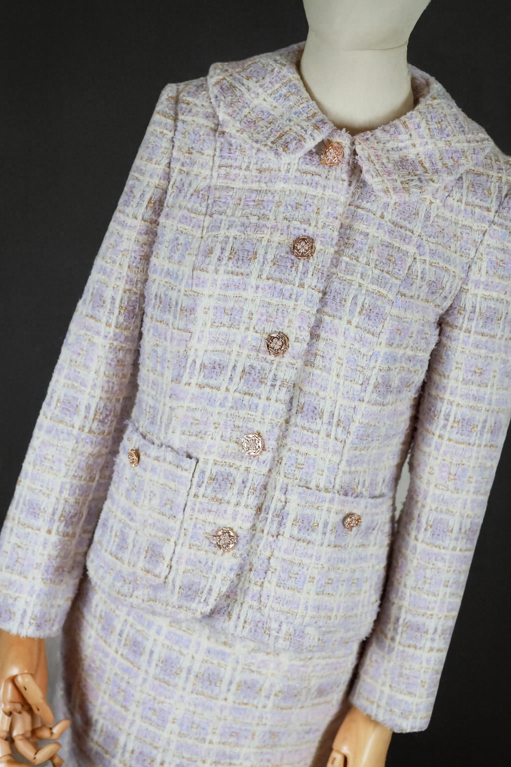 Channeling the ethereal charm of the rare allure of the Lilac Orchid, this ensemble is crafted from a luxuriously thick blend of white and lilac tweed. Subtle golden accents infuse the fabric, elevating its sense of opulence. The blazer, complete with elegant long sleeves, and the skirt are harmoniously adorned with refined golden buttons. These exquisite details create a cohesive and enchanting look, perfectly complementing the ensemble’s rich fabric.