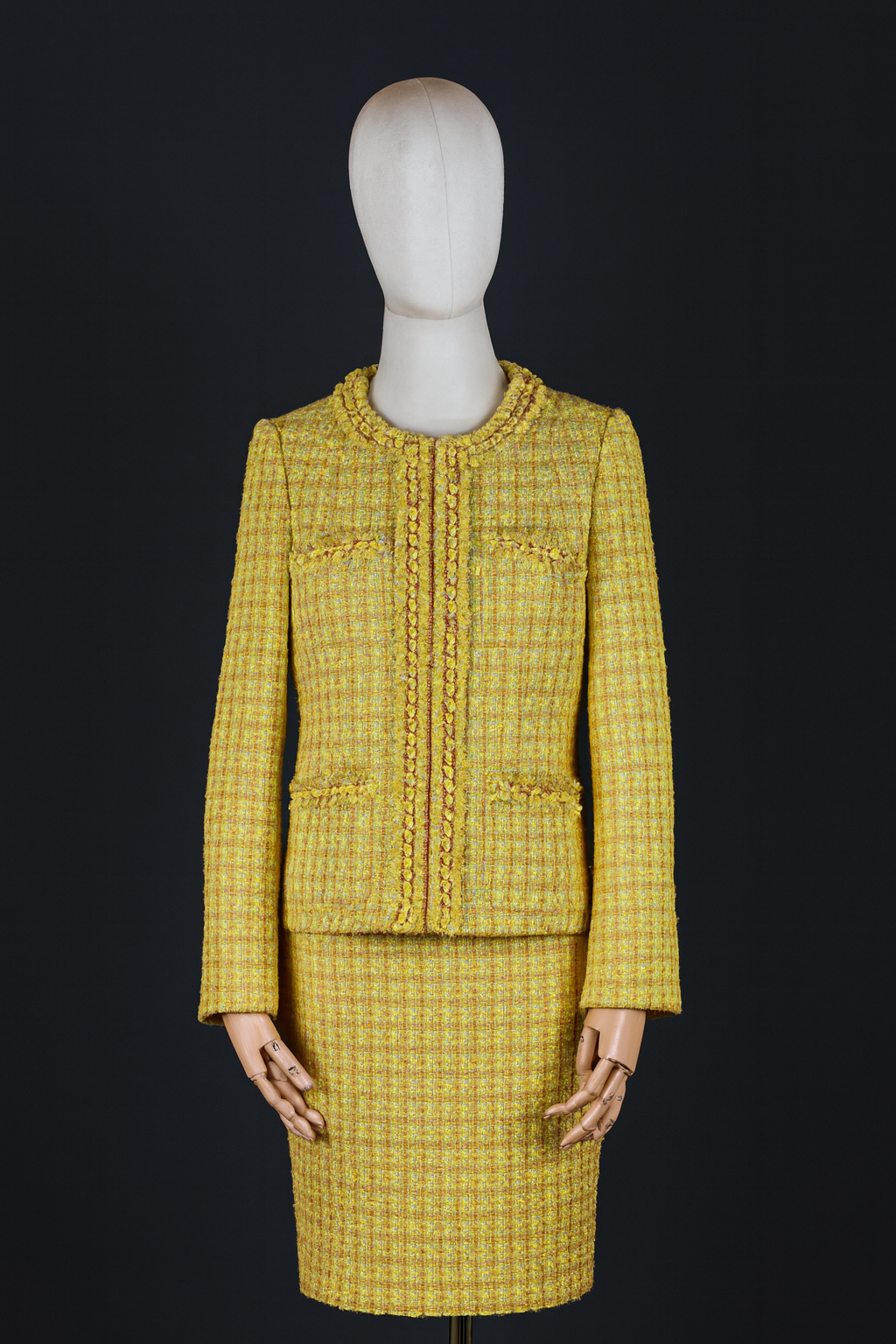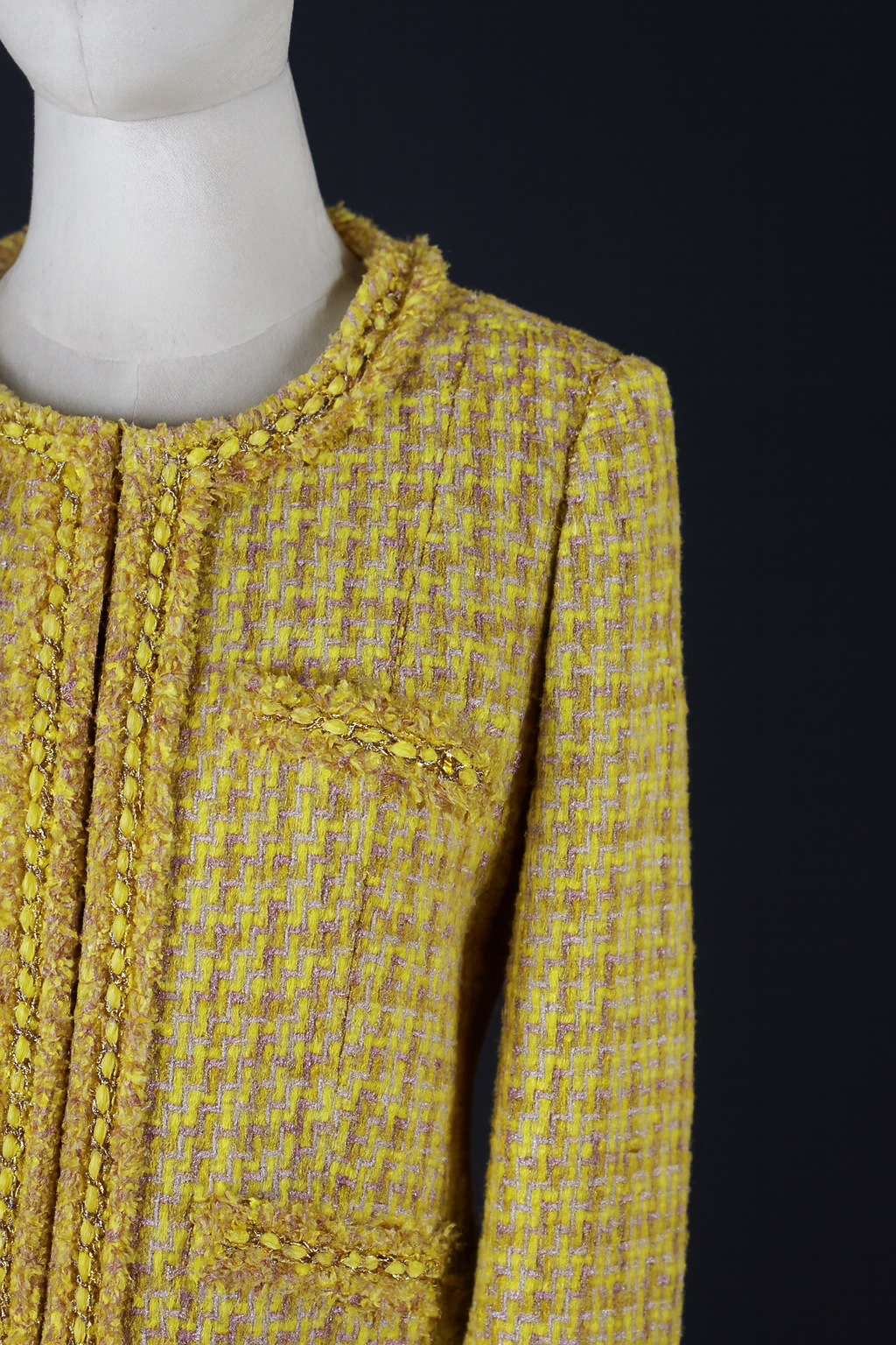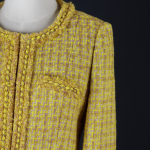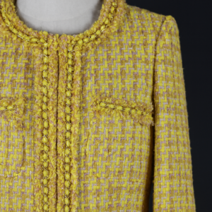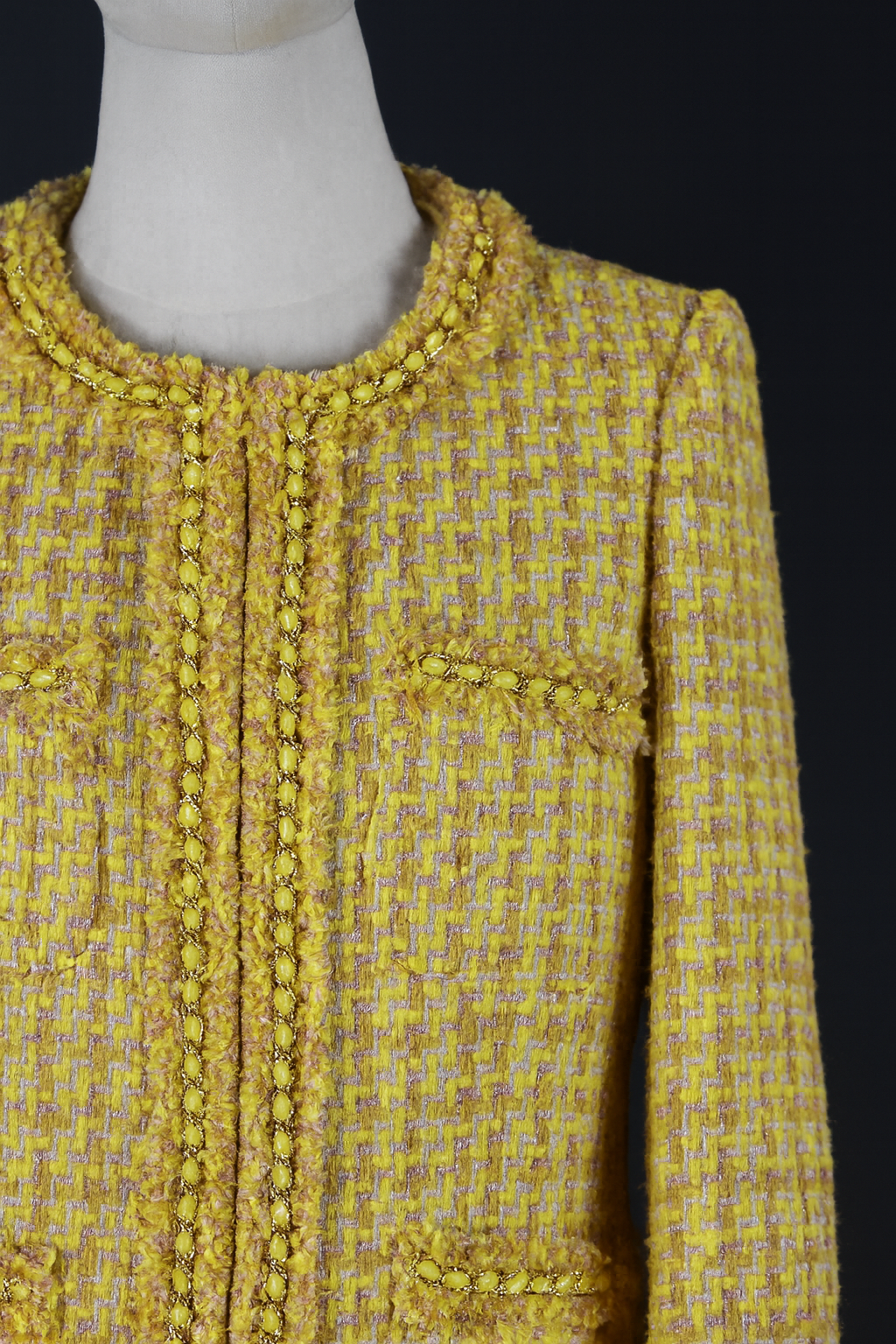 Capturing the warmth and vibrancy of a Sevillian sunburst, this elegant ensemble is fashioned from light yellow tweed, imbued with subtle golden undertones. The richness of the hue is perfectly complemented by exquisite gold chain decorations that adorn the blazer, elevating the outfit to a new level of luxury. The blazer ensures a polished finish with its finely crafted gold hooks.